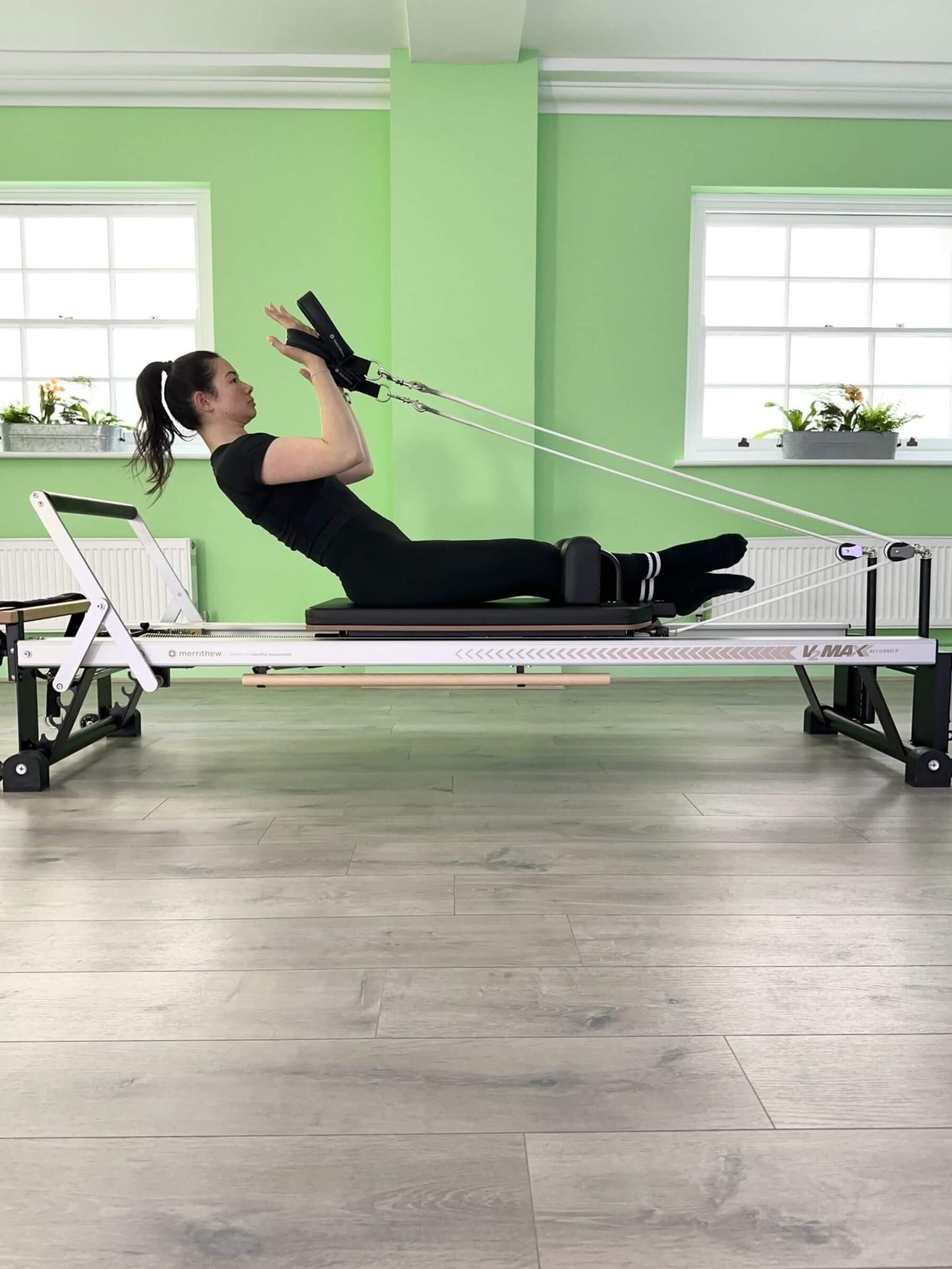 Using the Pilates Reformer machine to improve strength, flexibility and control.